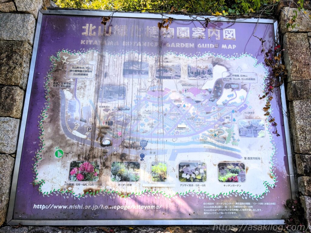 北山緑化植物園のご案内や、園内マップ(劣化していて読み難い)、自動販売機もあります。