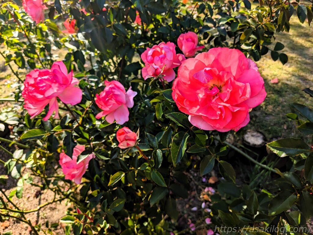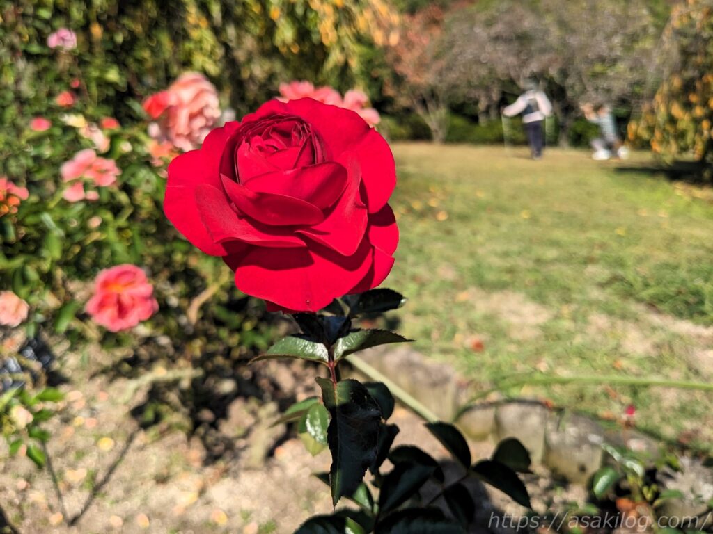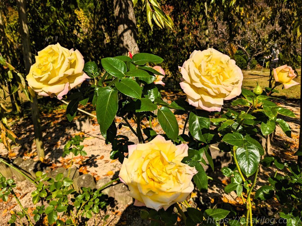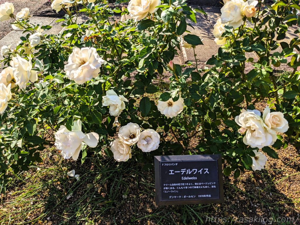 噴水スポット近くのバラ花壇には、約70種80株のバラが植えられているそう。どの秋バラも綺麗でしたが、娘が「エーデルワイス」を見つけて嬉しそうに歌っていました。