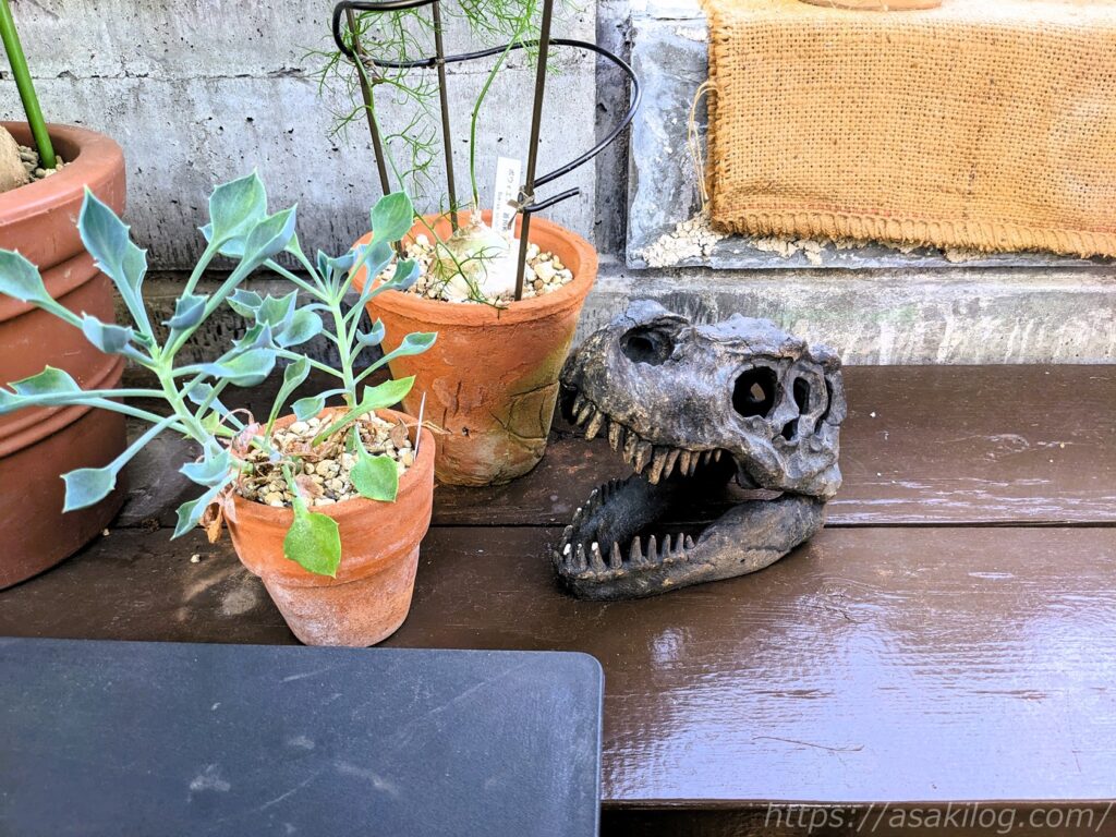 こちらの写真は、展示温室にあったオブジェ。本物の恐竜の頭蓋骨に見えてビックリ(笑)。