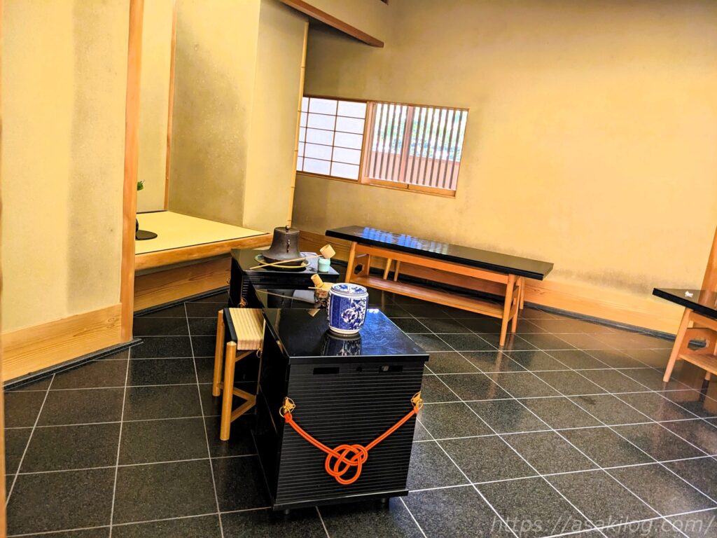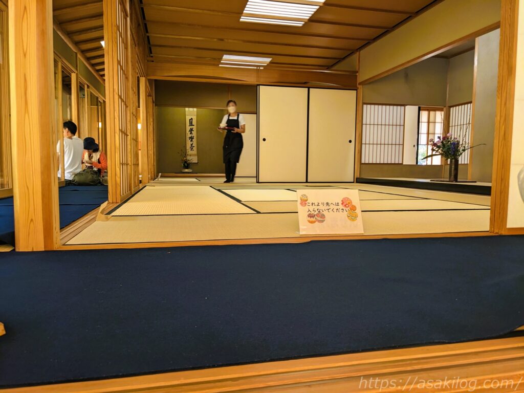 こちらの個室や、紺色のジュータンが敷いてある縁側コーナーで、お抹茶と和菓子のセット(500円)をいただけます。
