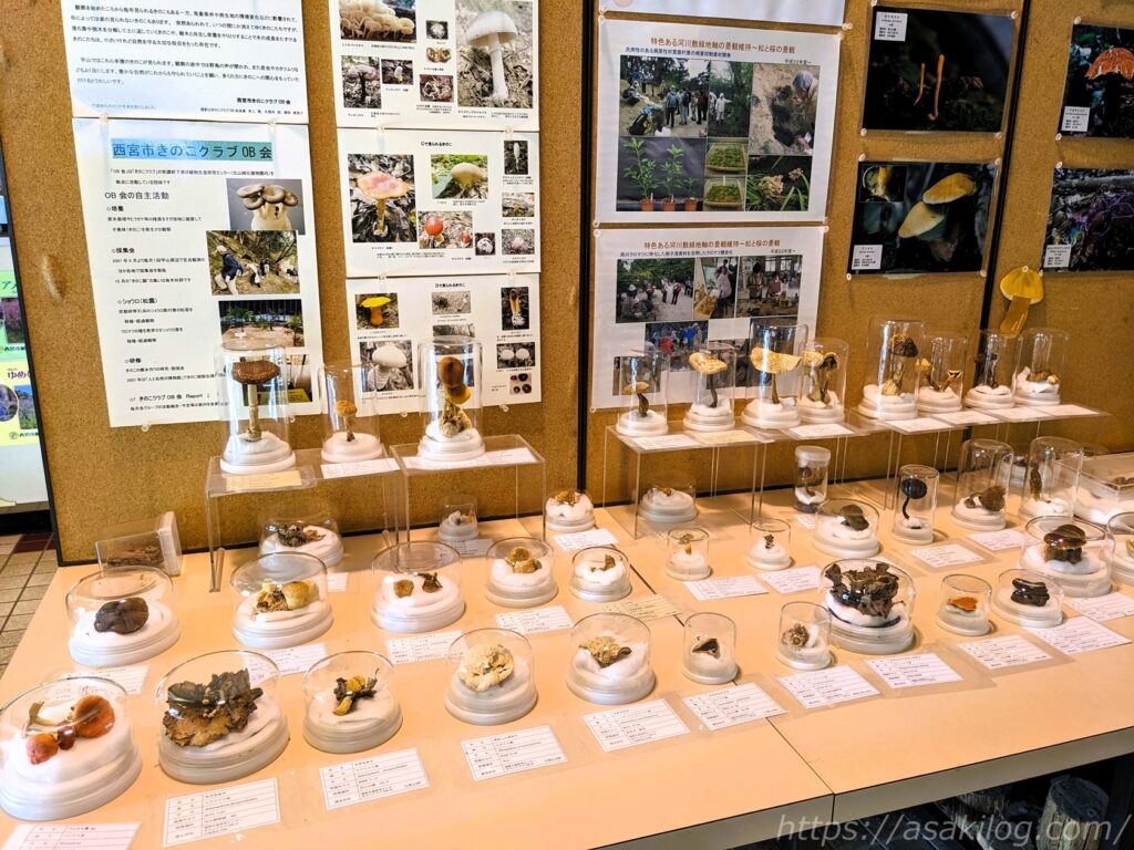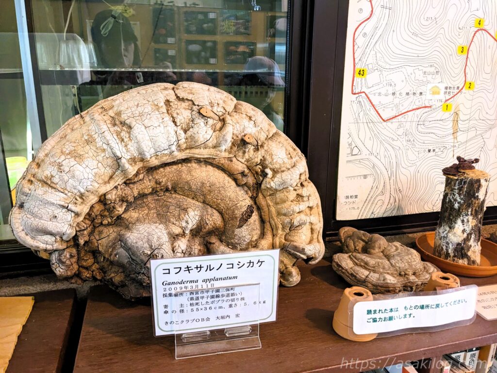 センター内には、ほかにもいろいろな展示物があり。いろいろな種類のきのこの標本や、枯死したポプラの大きな切り株「コフキサルノコシカケ」など。奥には培養室もあり、中の様子を観察できます。