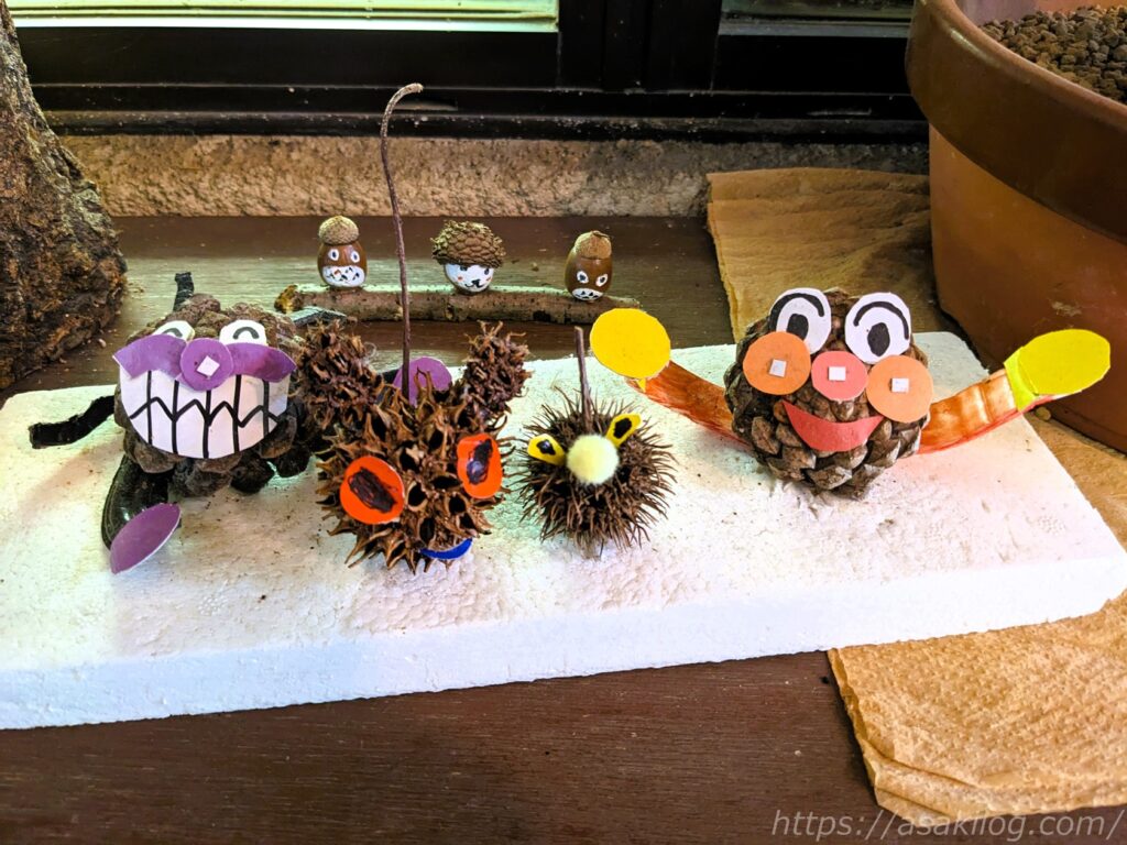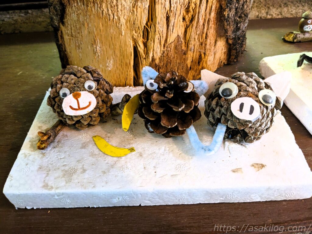 アンパンマンのキャラクターや、可愛らしい動物たちの松ぼっくり。よく考えて作ったなぁと感心。