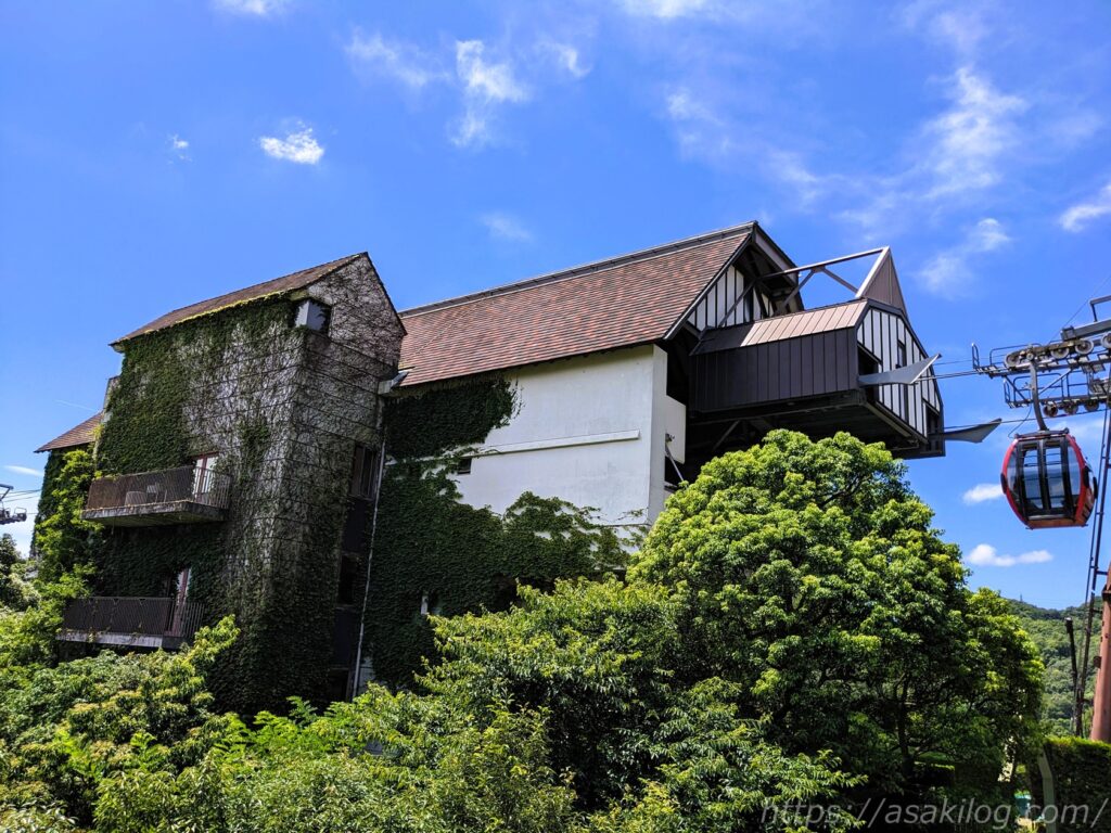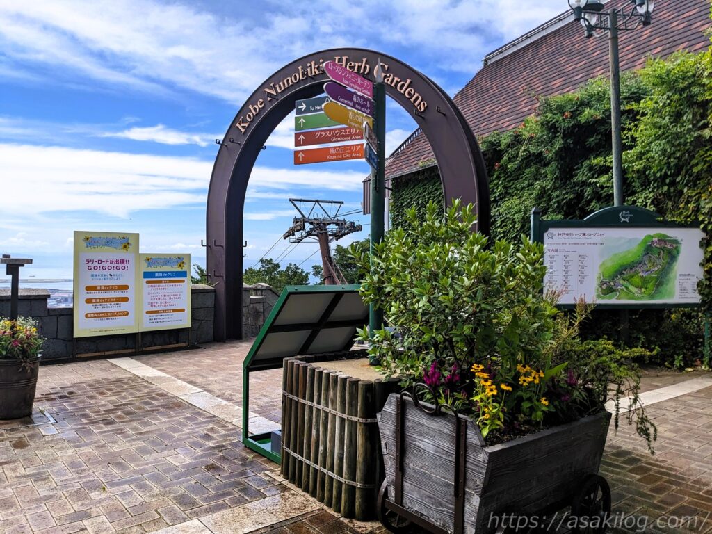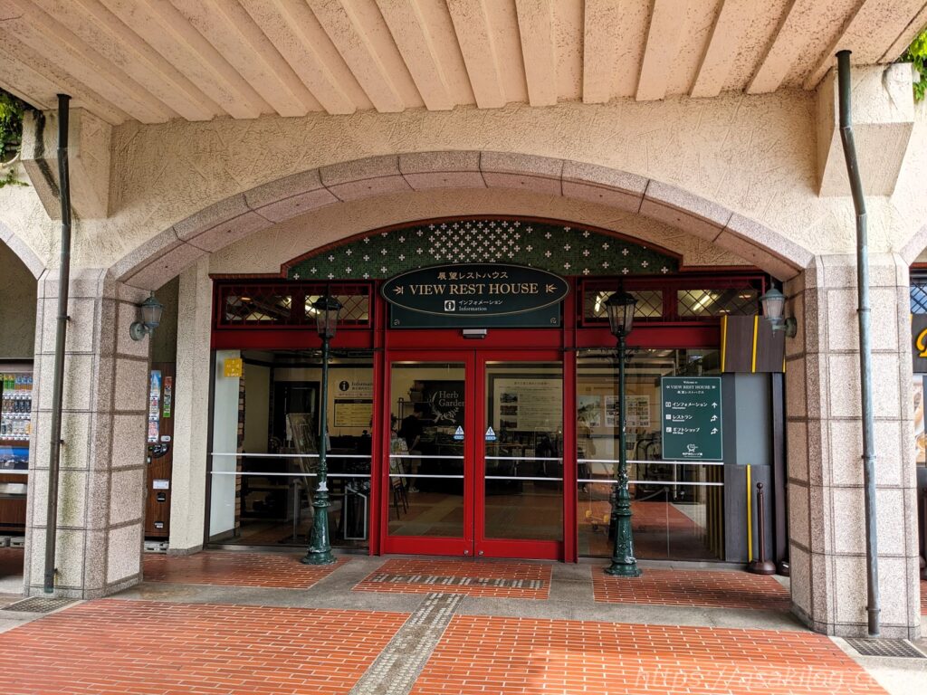 ロープウェイを下りるとすぐ目の前には展望レストハウス入口があります。そして右側のアーチが、ハーブ園山頂駅~風の丘中間駅への散策ルート入口になっています。