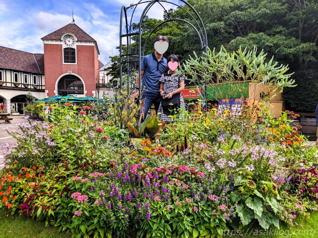 展望プラザのウェルカムガーデンでは、鮮やかでカラフルな夏の花々がたくさん咲いていました。記念撮影にもぴったりのコーナーです。(写真は夫と娘)