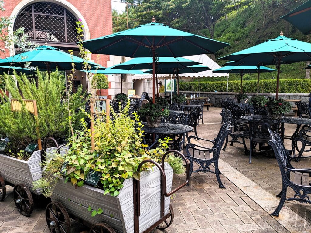ここではいろいろな種類のテラス席を用意、広い空と鮮やかな緑に囲まれた開放感たっぷりの空間です。