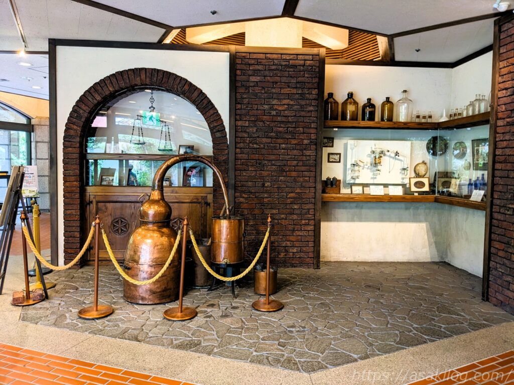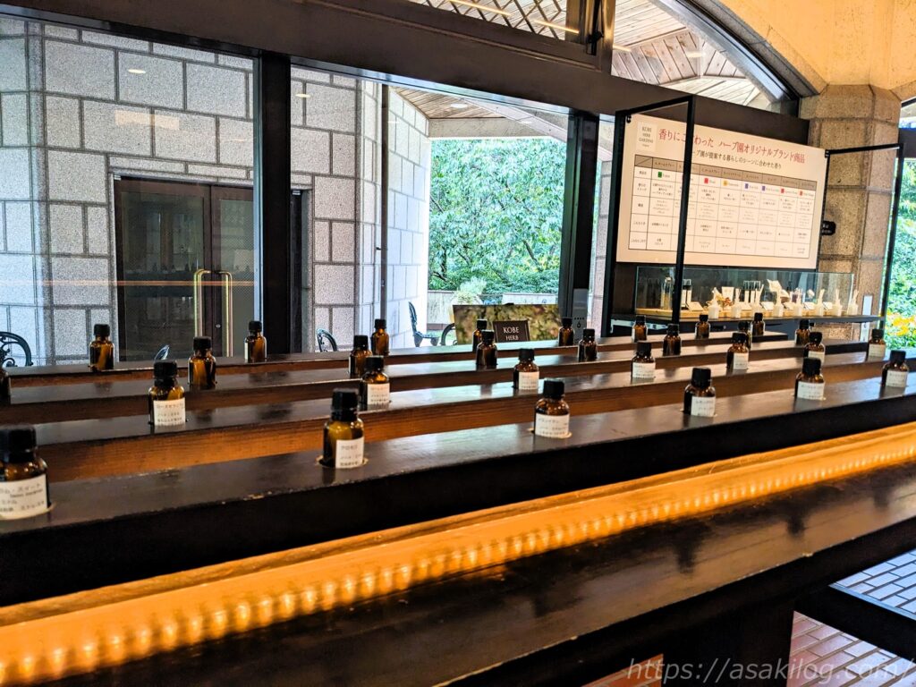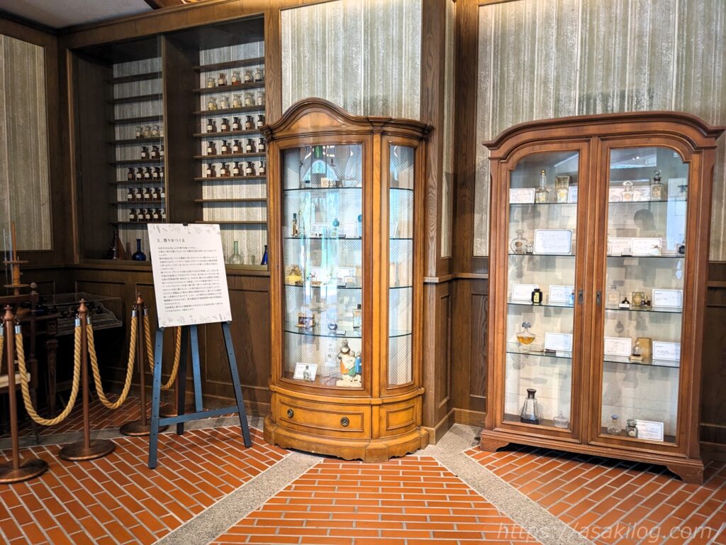 香りの資料館では、アンティーク香水瓶や香りを抽出する道具などを展示。また約80種類の天然エッセンオイルの香り比べや、香りと暮らしの展示も行われています。