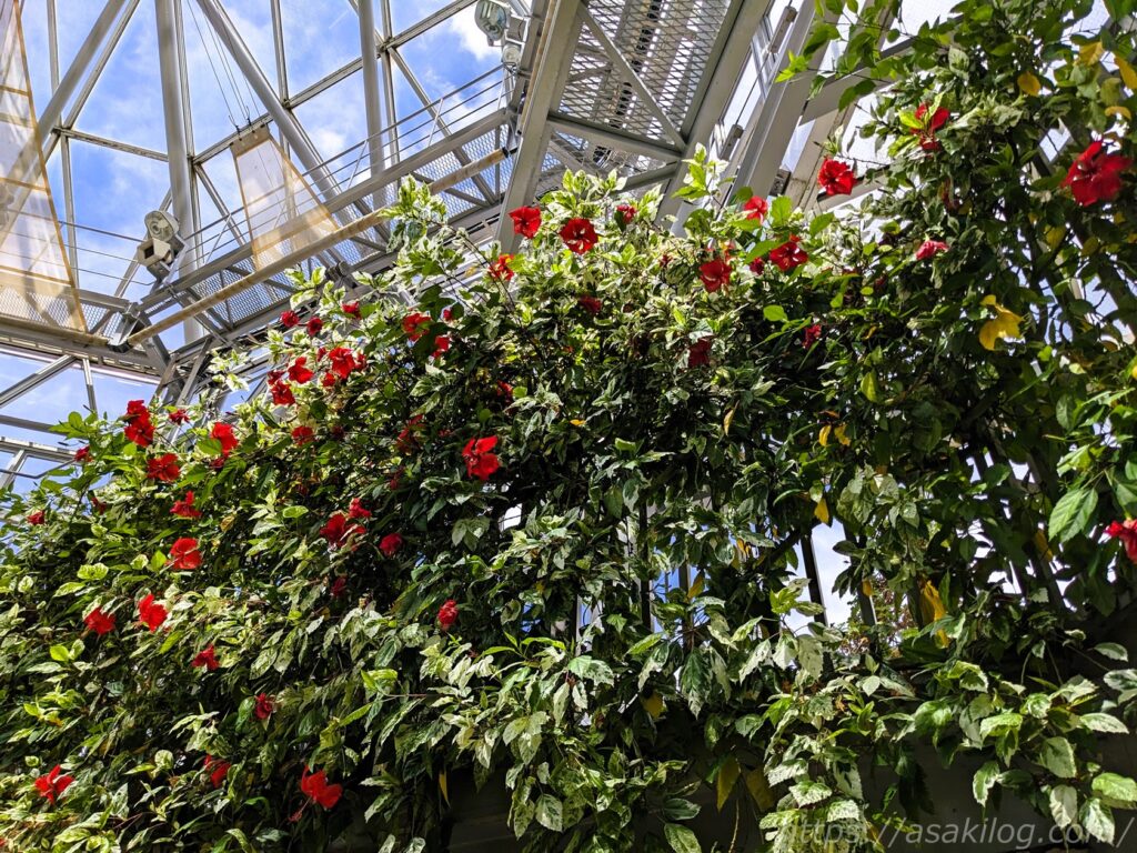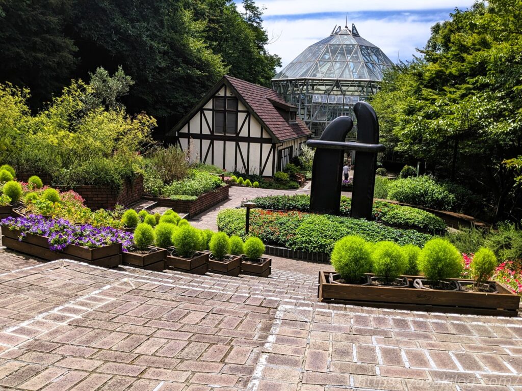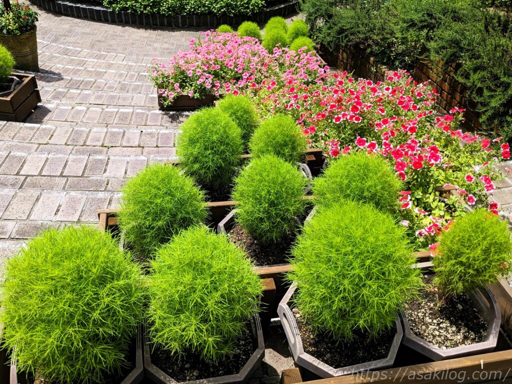 グラスハウス手前はちょっとしたガーデンになっていて、色とりどりの夏のお花や、爽やかなライムグリーンのコキア(和名はホウキギ・ホウキソウ)が並んでいます。コキアはまるまるモフモフした形が可愛いですよね。