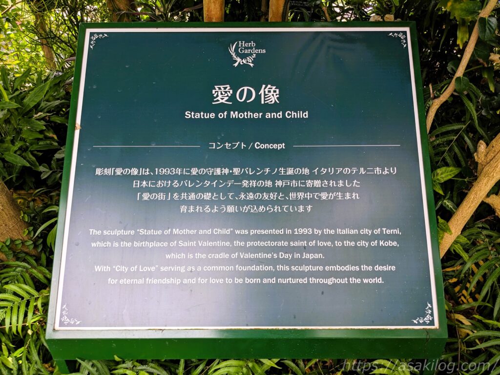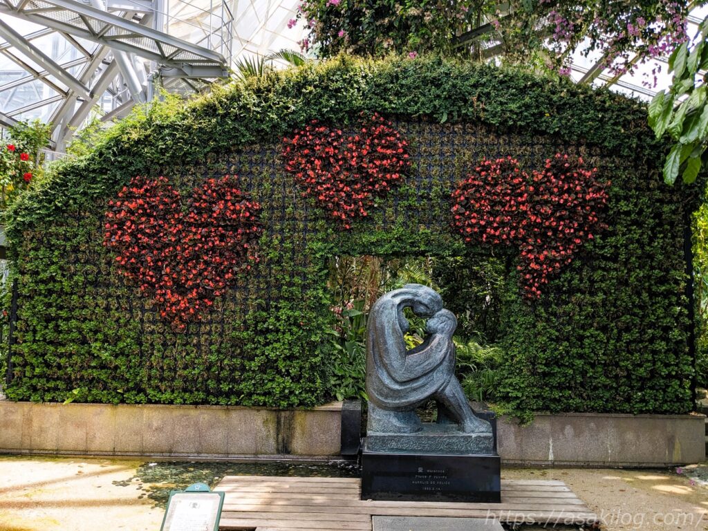 グラスハウス(温室)の奥に佇む彫刻「愛の像」は、1993年に愛の守護神・聖バレンチノ生誕の地・イタリアのテルニ市から、日本のバレンタイン発祥の地・神戸市に寄贈されたものなんだそう。