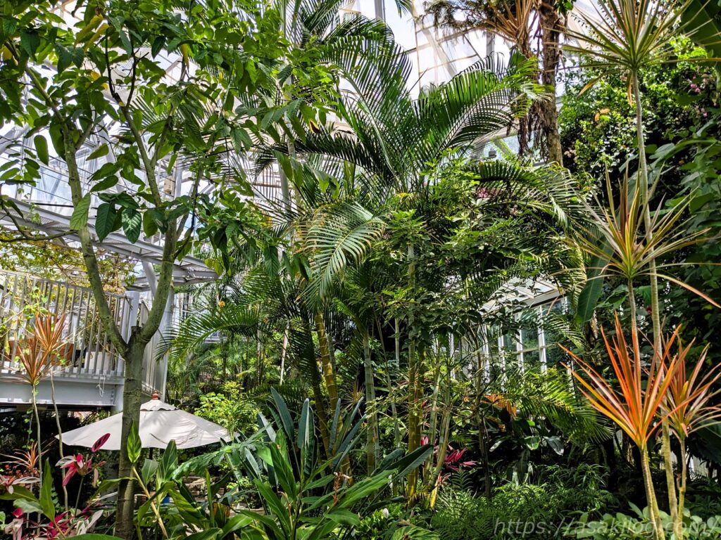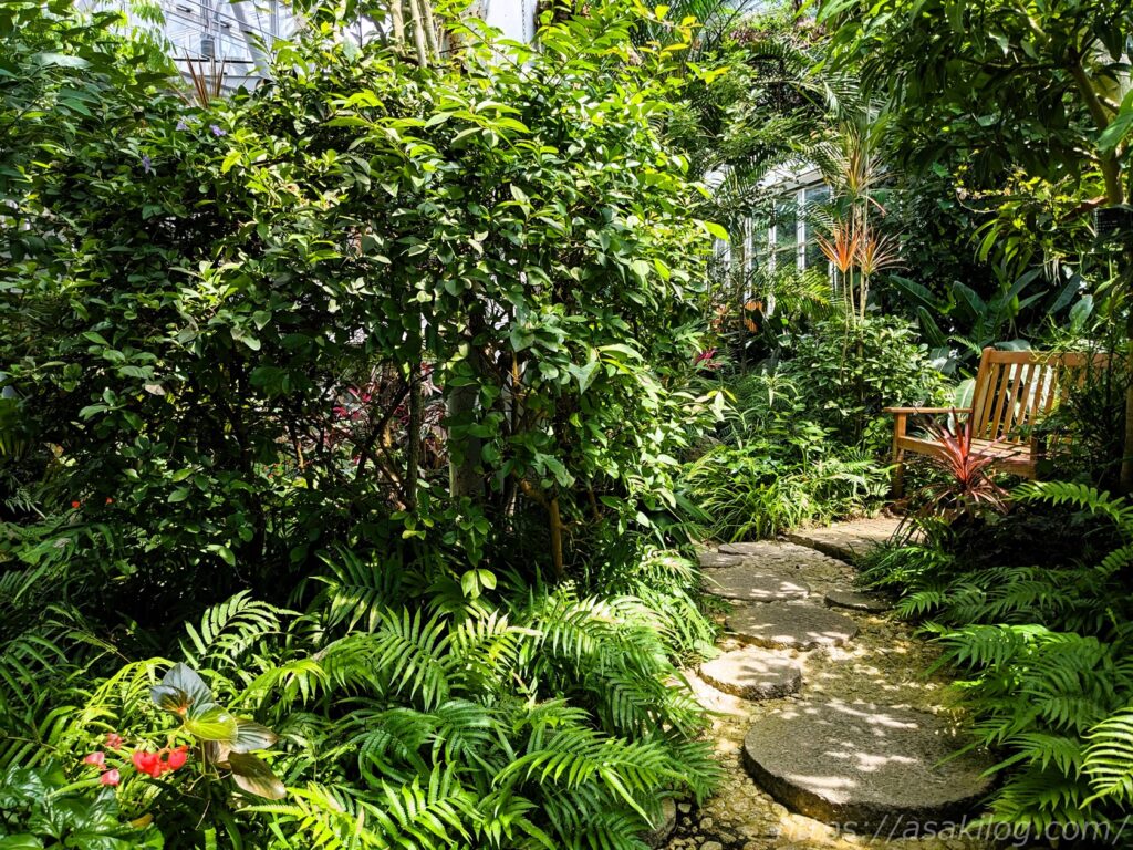 グラスハウス(温室)は、スパイス・果実などの熱帯性植物を中心に植栽されたガーデンです。ちょっと散策するだけでも、熱帯らしい素敵な空間に出会えます。ベンチやチェアなどもあるので、緑に囲まれて休憩しても。
