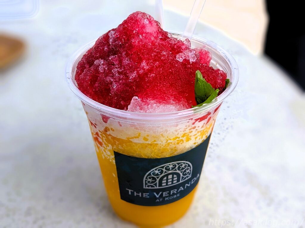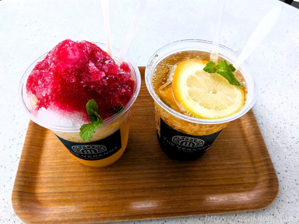 「ハーブフラッペ(ハイビスカスマンゴー)」は、冷たいかき氷が乗っていてマンゴー好きにはたまらない味。娘も喜んで食べていました。「オレンジとレモンのティーソーダ」は、大人向けのさっぱりとした味わいのドリンクでした。
