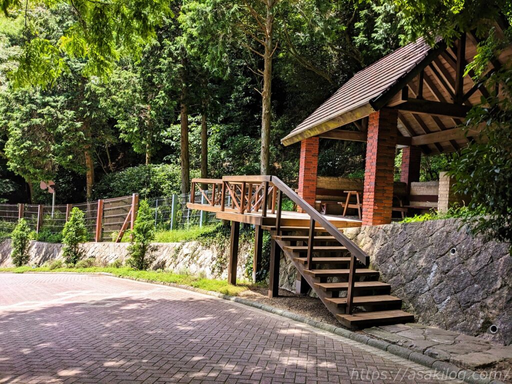ハーブ園山頂駅~風の丘中間駅への散策は、こちらの展望プラザのアーチ(右側)から入ります。風の丘中間駅まで、山の斜面を下りながら散策するルートとなります。