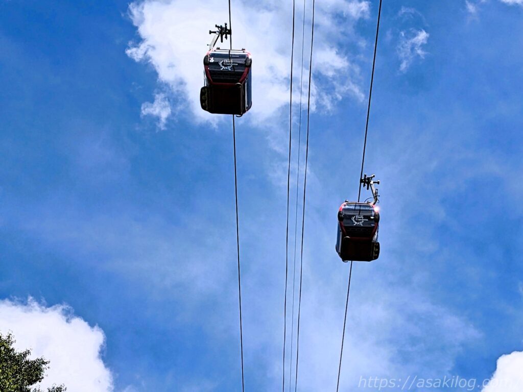 ラベンダー園から空を見上げると、真上をロープウェイが行き交っています。