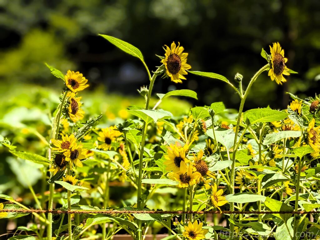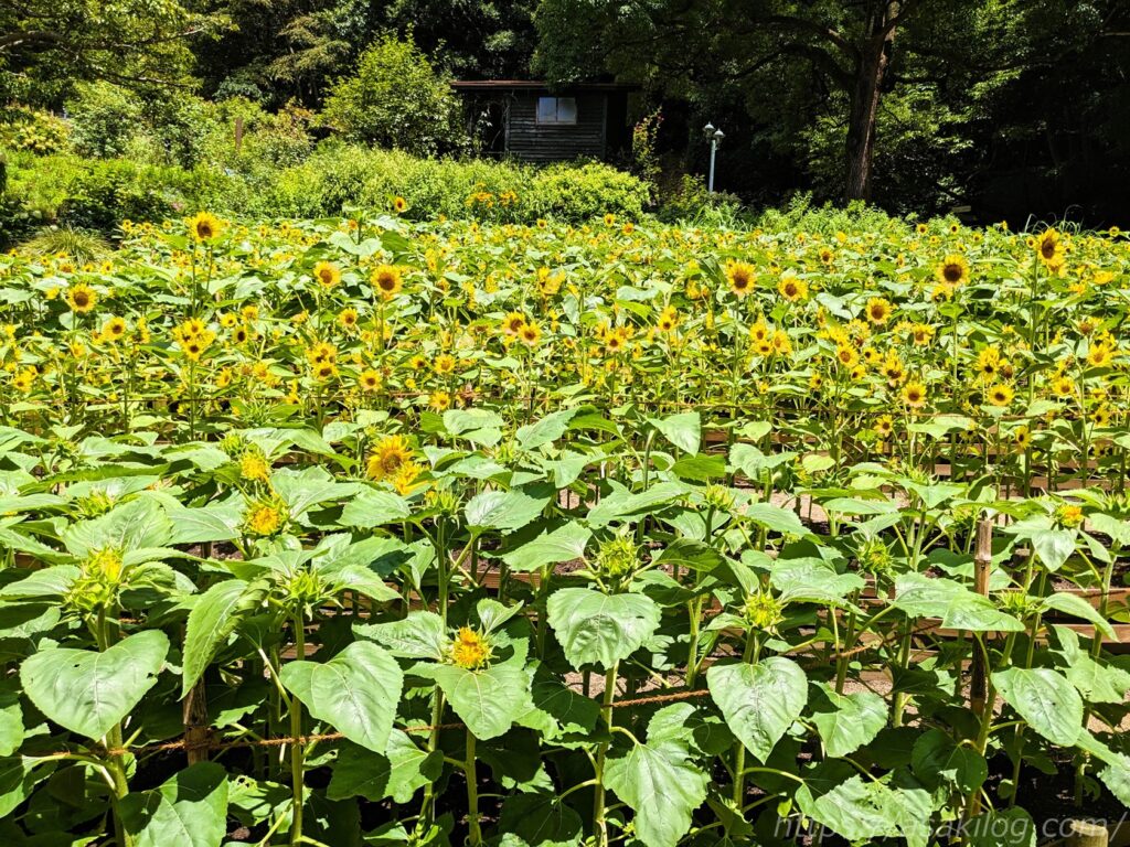 四季の庭「よろこびの庭」の段々畑では、ひまわり畑を見ることができます。農機具や収穫したハーブを乾燥保存するためのガーデンシェッド(小屋)を背景に、可愛らしいひまわりがたくさん咲いていました。