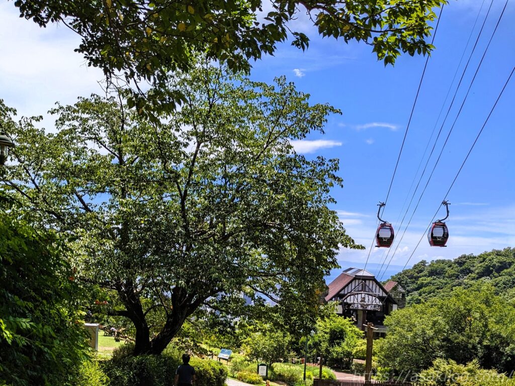 ゆっくり散策したかったのですが、あまりに暑過ぎて早々に移動することに。右側にはロープウェイと風の丘中間駅が見えました。