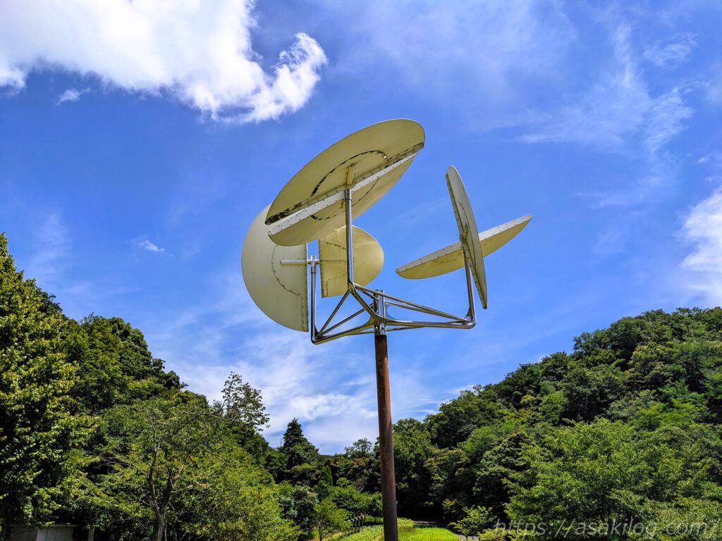 ここは神戸の絶景とともに山桜・ユリ・紅葉など四季を感じる癒しのエリアなんだそう。風の丘芝生広場のシンボル的存在「白い星座」が、風に吹かれてクルクル回っていました。