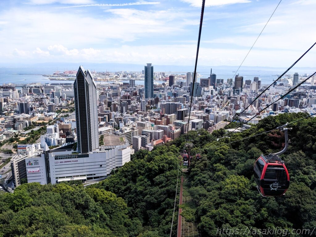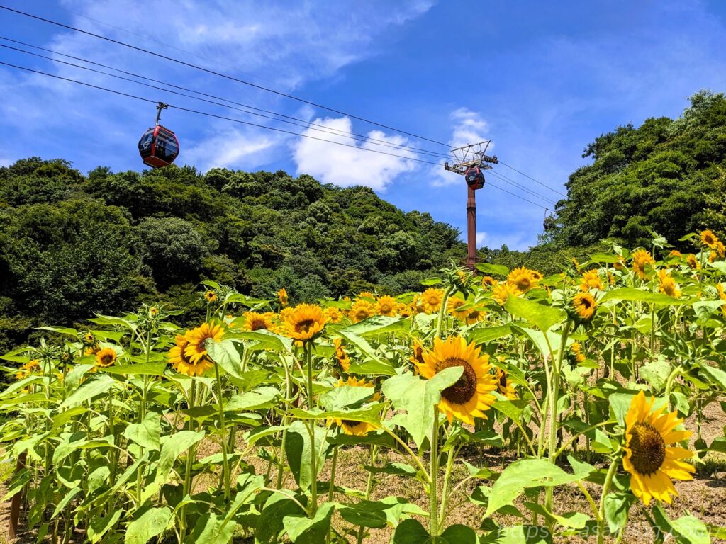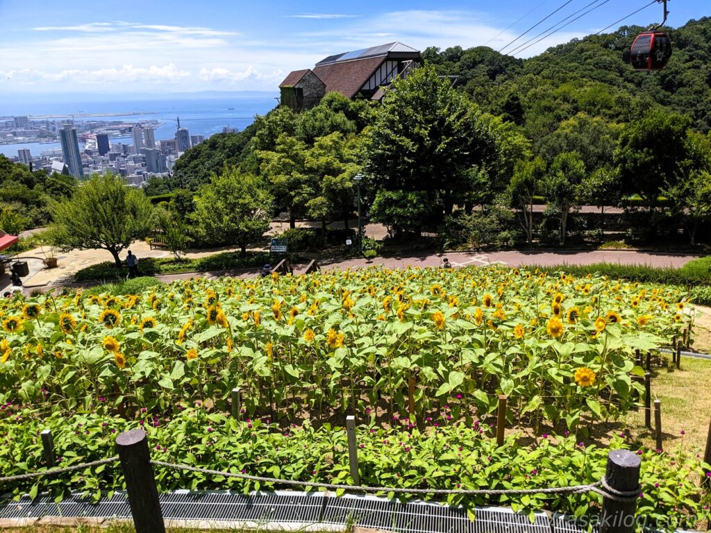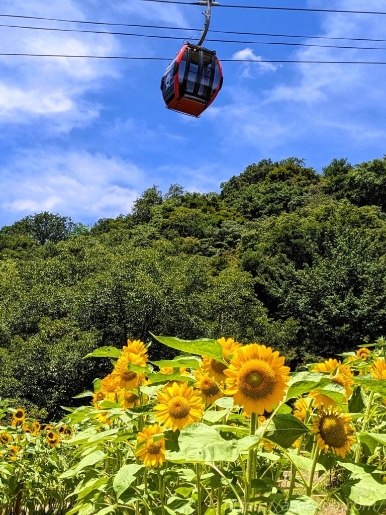 ロープウェイで行き来すると、風の丘フラワー園のひまわり畑や、布引の滝も見えましたよ。