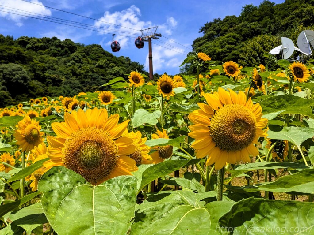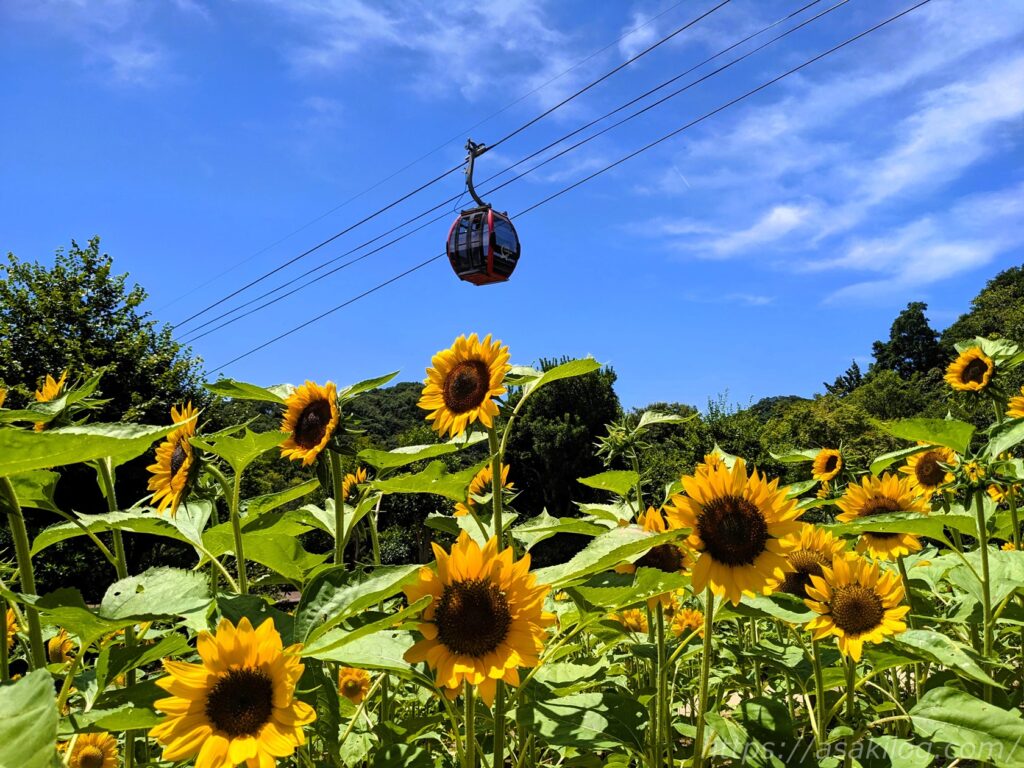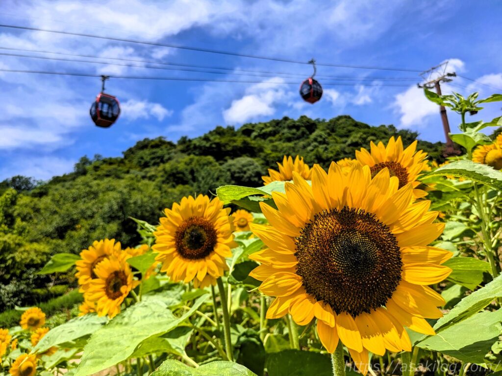 風の丘フラワー園のひまわり畑では、ひまわりの写真をたくさん撮影しました。蜂さんはもちろん、ロープウェイ・夏の青空との共演がとっても絵になります。