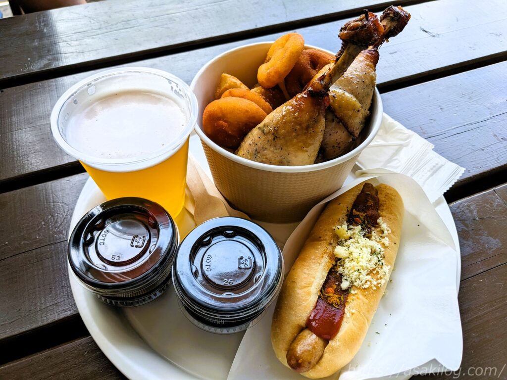 今回はこちらで軽いランチをとることに。「ホットドッグ(カリーブルスト)」「シーズナルチキンプレート(ポテトとハーブチキンの盛り合わせ)」「アサヒスーパードライ」をオーダーし、3,050円でした。