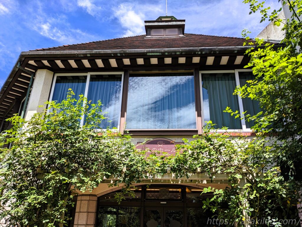 ローズシンフォニーガーデンの奥にあるのが「森のホール」。こちらの建物1Fには「香りの資料館」があります。