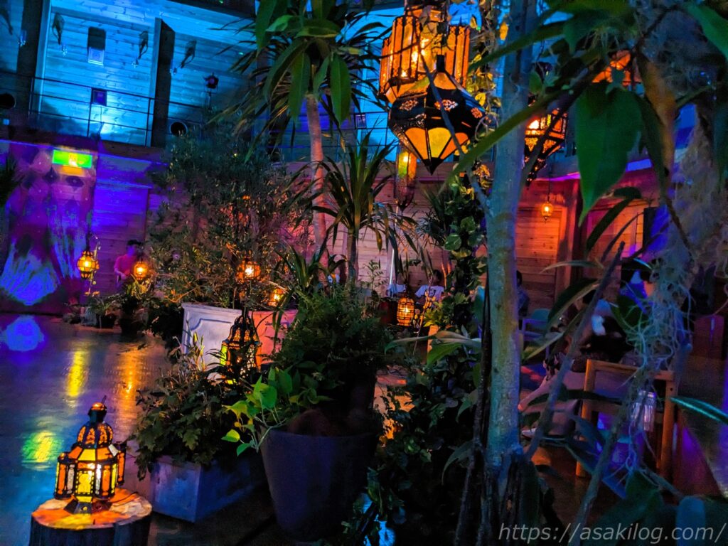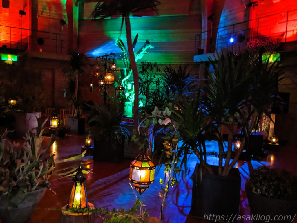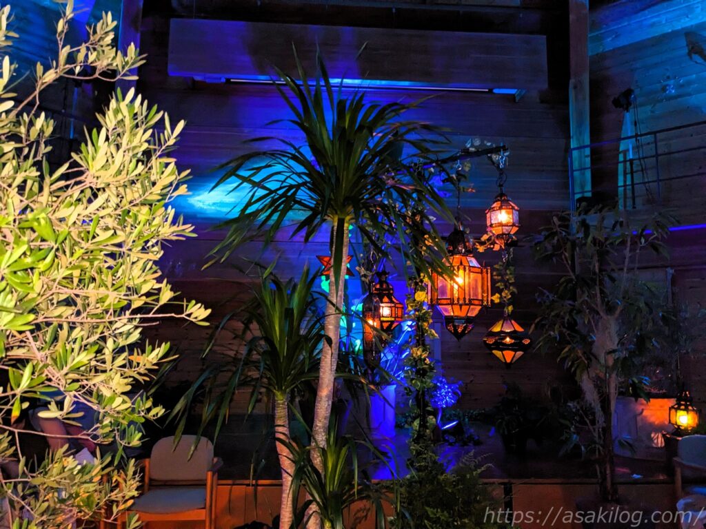 4つのシーン(青い鳥の鳴く森・サンゴ礁の海辺・遊牧民の草原・星明りの宇宙)に合わせて、モロッコランプ・空間の色・音が移り変わり、1シーンは各5分くらいなんだそう。