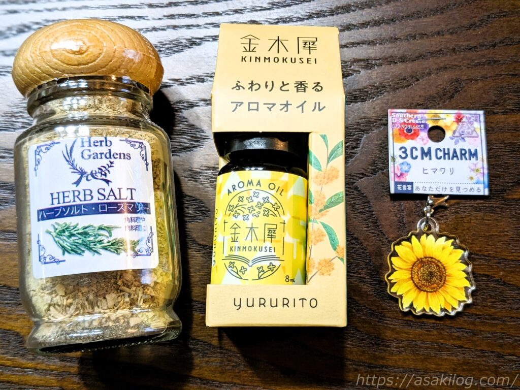 今回は「ハーブソルト ローズマリー」「金木犀アロマオイル」「フラワーチャーム ひまわり」の3つを購入、1,578円でした。