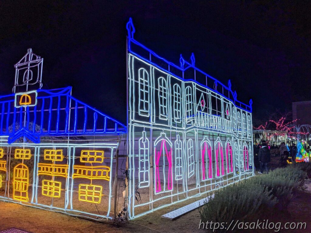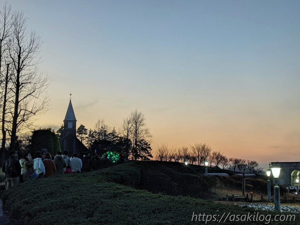 17時15分ごろ入場して、まだ明るく点灯開始まで時間があったため、一番奥の「神戸ホテル フルーツフラワー」まで移動することに。こちらのお宿には泊まったことがありませんが、オランダの国立美術館を模したお城のような外観のホテルで、源泉かけ流しの露天風呂もあるそう。