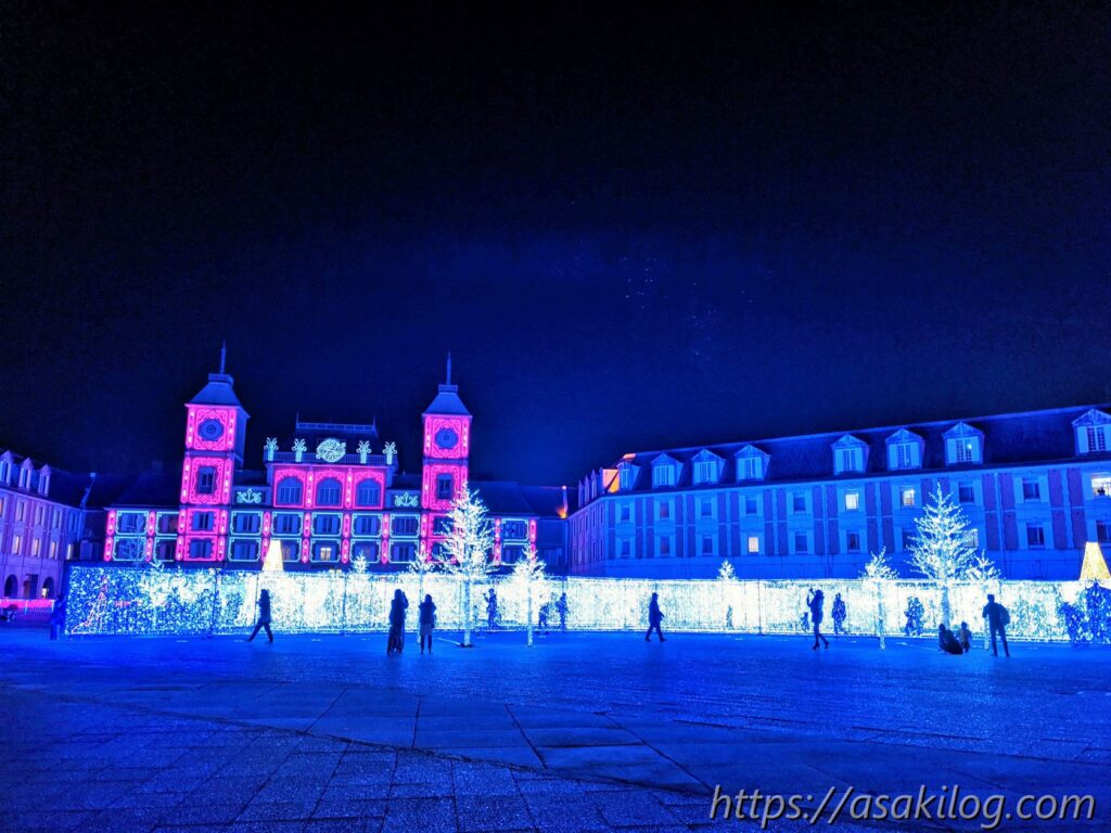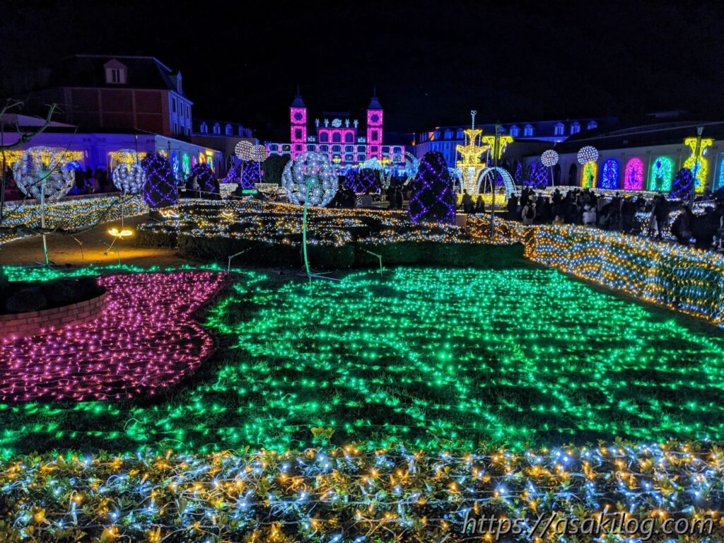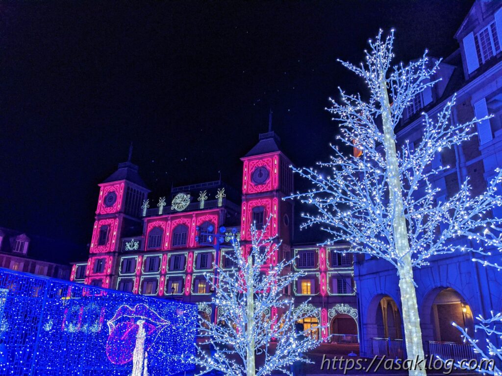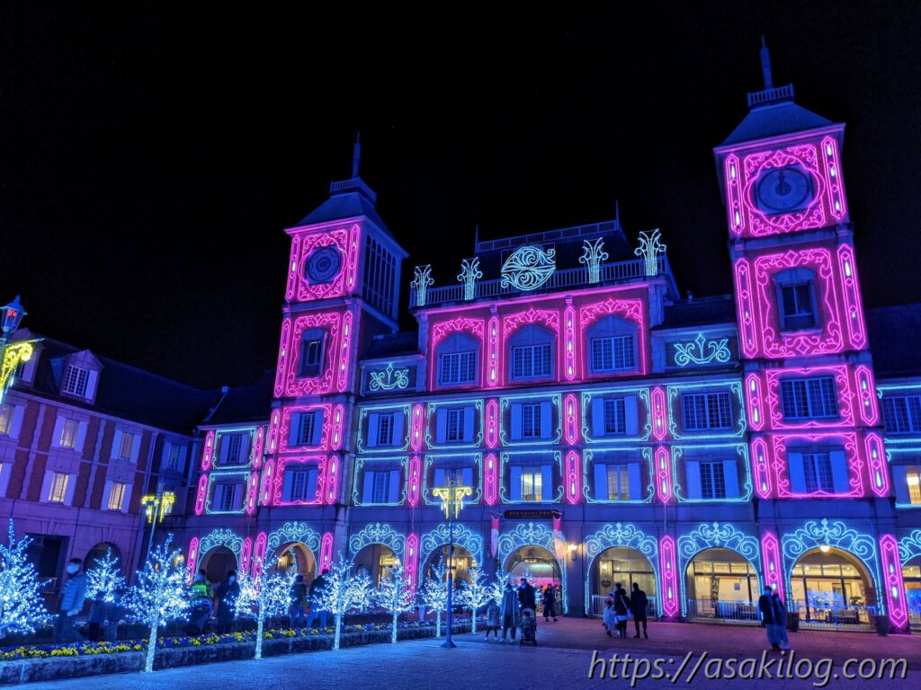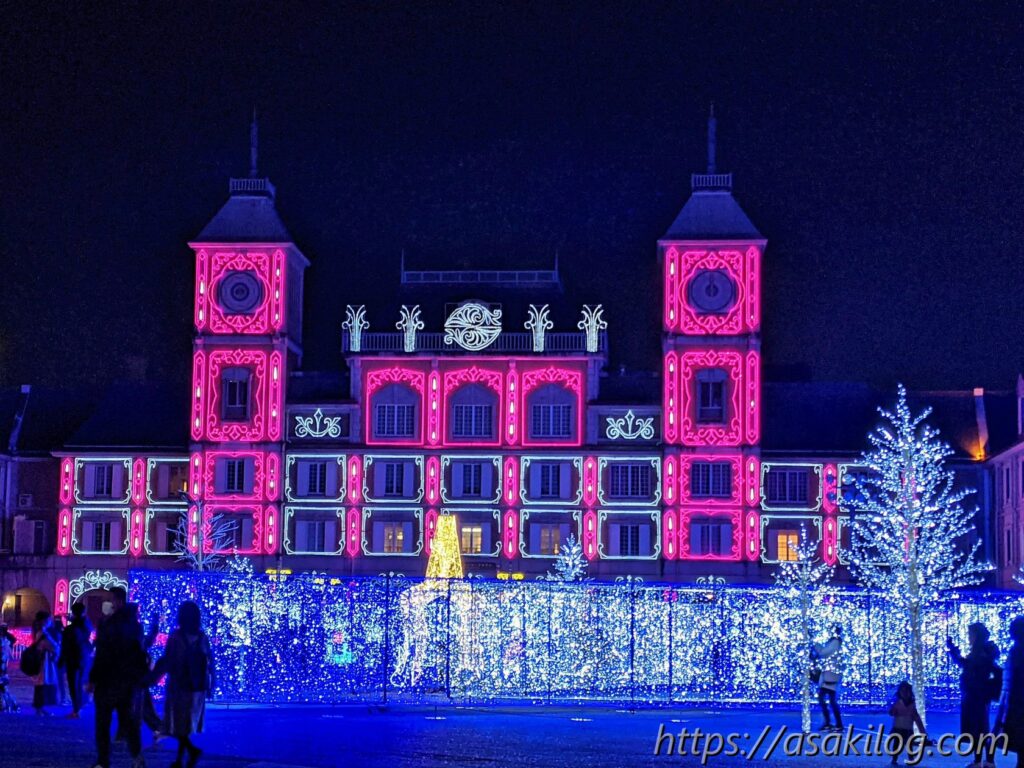 点灯とともにこの景色が目の前にに浮かび上がったときには感動しました。ピンク色のお城がキュートで、その周りのイルミネーションもとっても綺麗です。