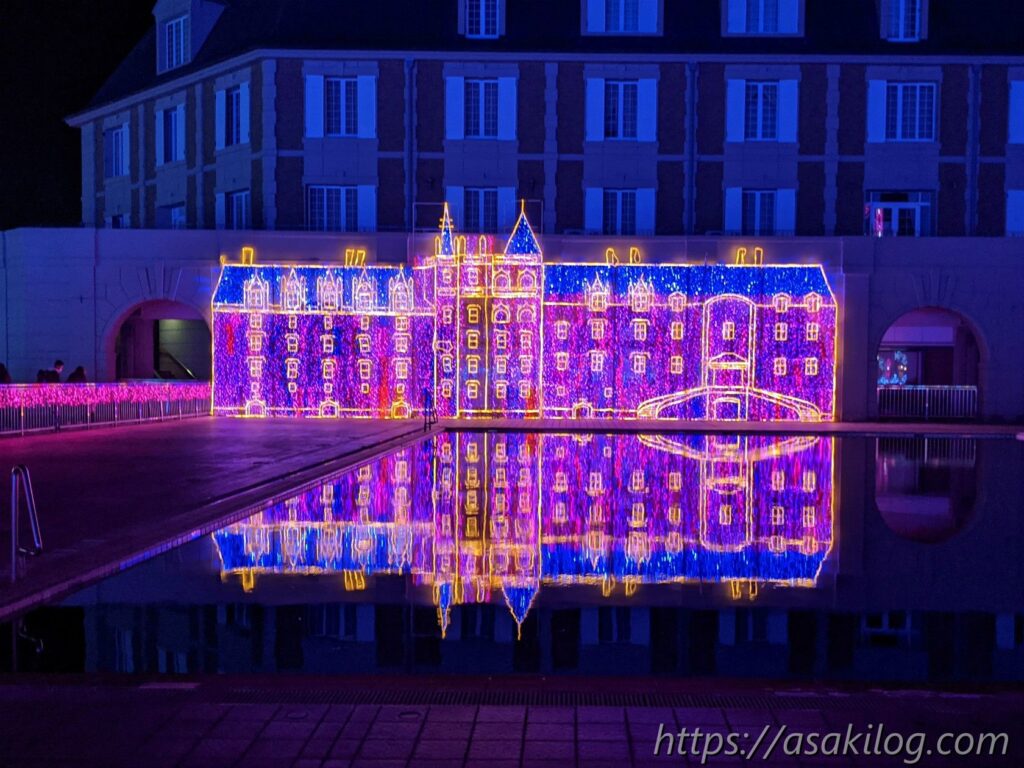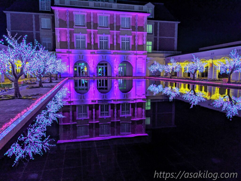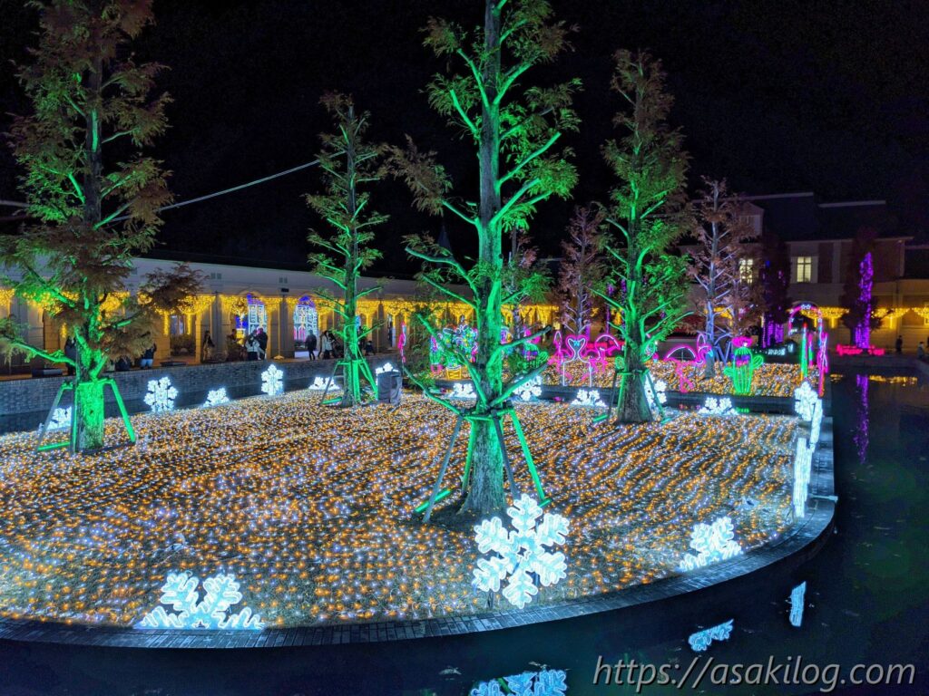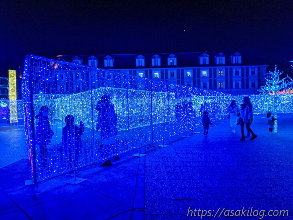 手前の水面にもイルミネーションが映し出されて、まるで鏡のよう。写真ではすぐ先に水面があるように見えますが、手前に柵が設置されているので安心です。