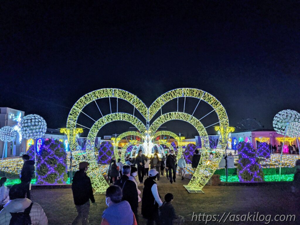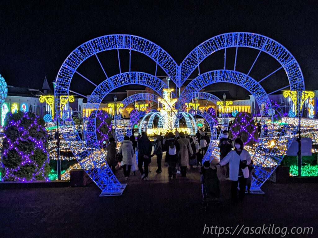 こちらのハートのイルミネーションは、色の変化が綺麗。人が多くてなかなかよい写真が撮れませんでしたが、可愛いイルミネーションに癒されました。