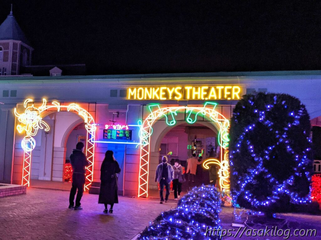 マジカルチェリーブロッサムエリアの指輪オブジェの横には、水面に映し出されるイルミネーションも。ここは柵が設置されていないので要注意!近くには「モンキーショー」の入口もありましたよ。