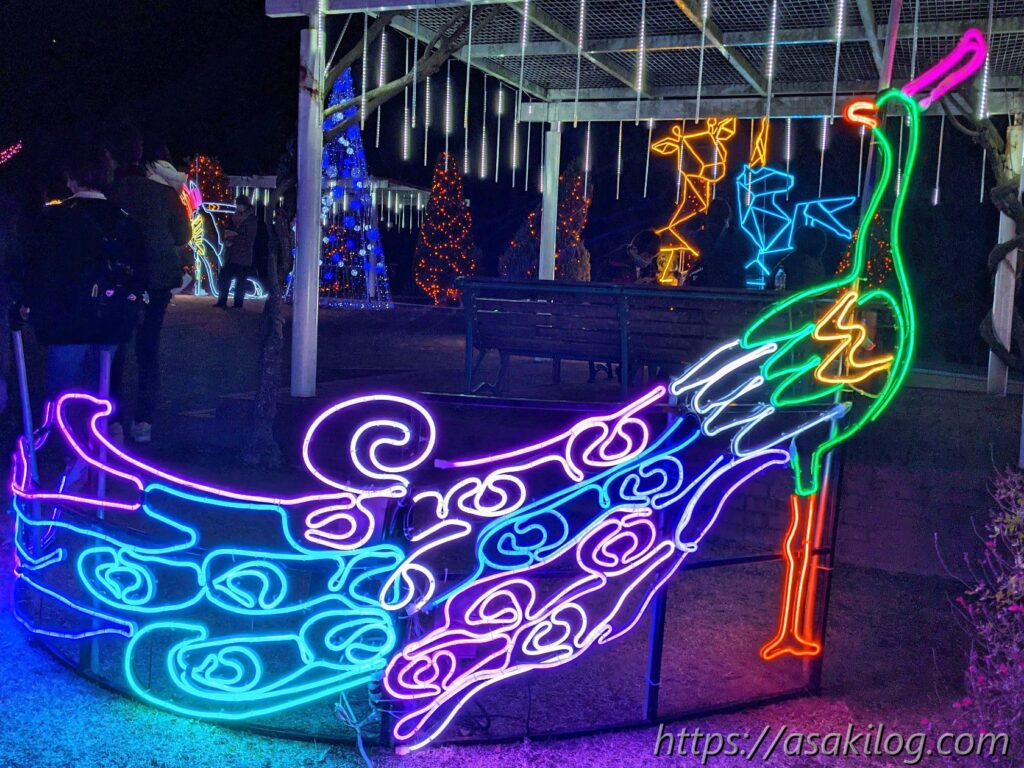 マジカルアイランド近くのコーナー「ワンダーファンパーク」にも、面白いイルミネーションが。お家に、クジャクに、ツリー? テーマがよく分からないのですが、綺麗なのでヨシとします。