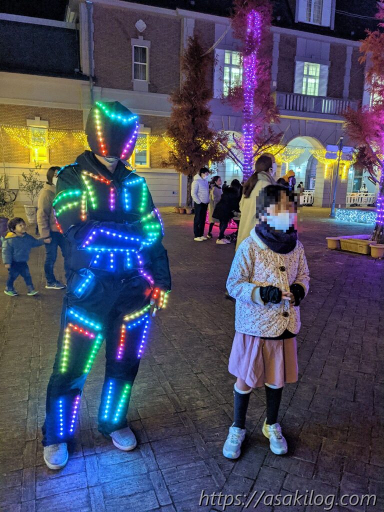 神戸イルミナージュの会場内を歩いていて見かけたのが、謎のイルミネーションマン?!なにやら全身にイルミネーションをまとって歩いていました(笑)
