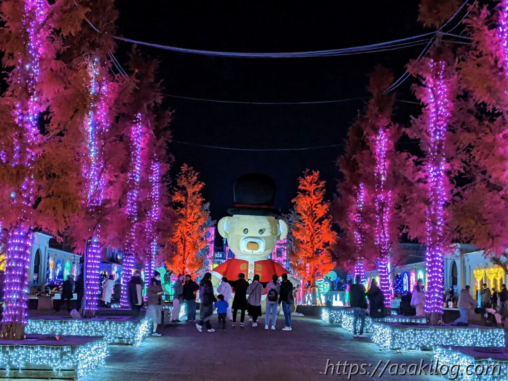 入場してすぐの場所にあったのが「6mビッグバルーンベアワンダーギミックショー」。大きなくまさんがデーンと座っています。イルミネーションにはなっていませんが、人気のフォトスポット。「ショー」というからには、何かショーをやる日もあるのかなぁ?