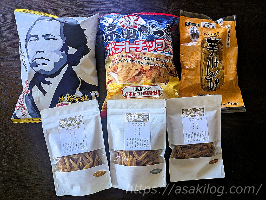芋けんぴ・ポン酢・ポテトチップス・ミレービスケットなど3店舗で、合計4,250円でした。(一部、ひろめ市場で購入したお土産も写真に入っています)