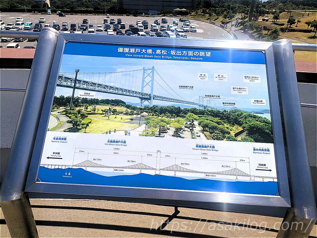 与島パーキングエリアの展望台からは、備讃瀬戸大橋・高松・坂出方面の景色を一望できます。真夏の日差しがめちゃくちゃ強い日でしたが、とても気持ちのいい絶景スポットでした。