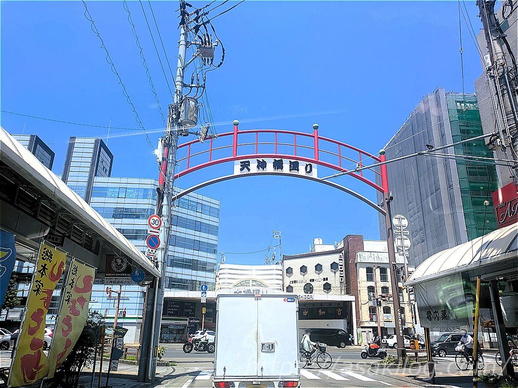 12時頃高知中央ICに到着し、まずは腹ごしらえすることに。高知のグルメスポット「ひろめ市場」に向かいました。途中でとさでん交通の路面電車を見かけたり、天神橋通りを通過して、12時半頃にひろめ市場の駐車場(タイムズ)に到着です。