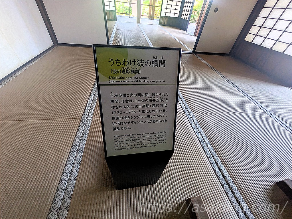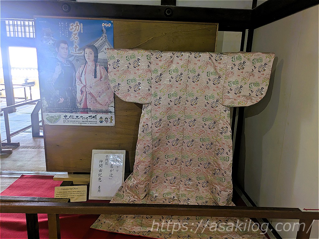 そして、下段の間と次の間に設けられた「うちわけ波の欄間(波の透彫欄間)」は、黒潮のデザインをシンプルに表したものなんだそう。近くには大河ドラマ「功名が辻」で仲間由紀恵さんが着用した着物も飾られていました。