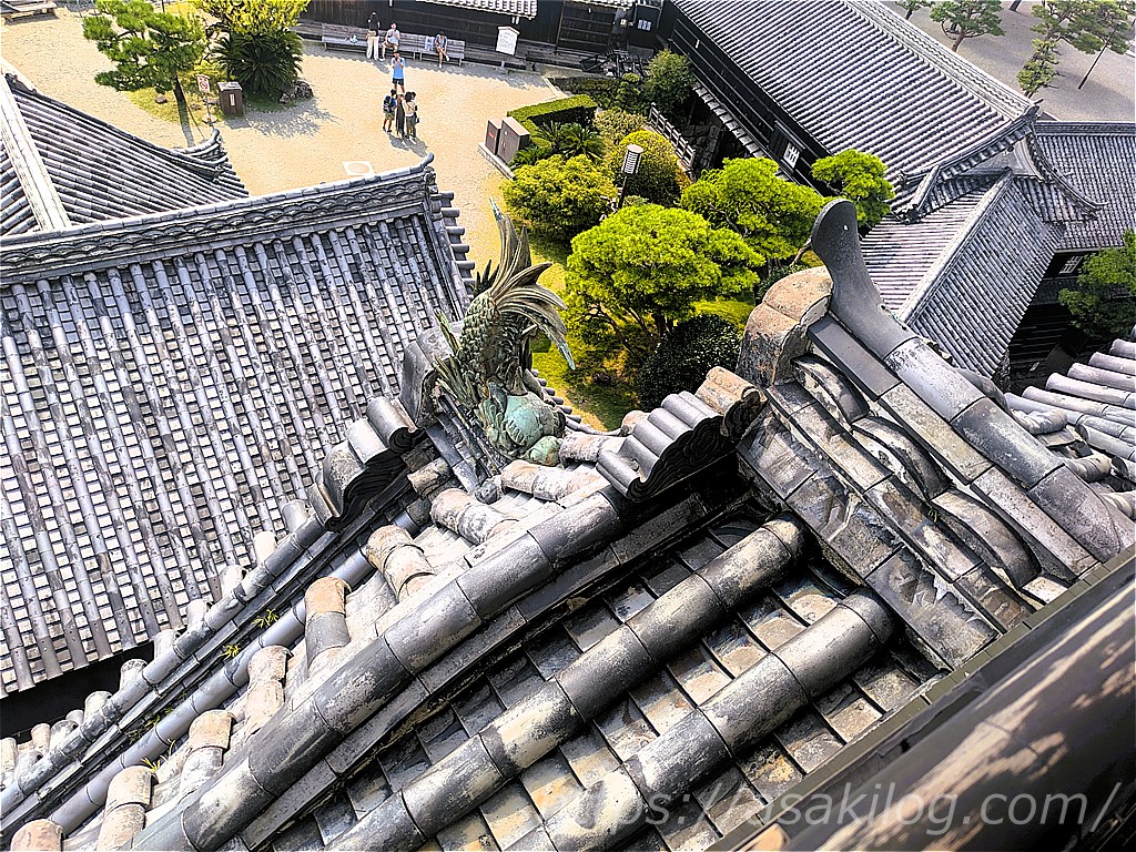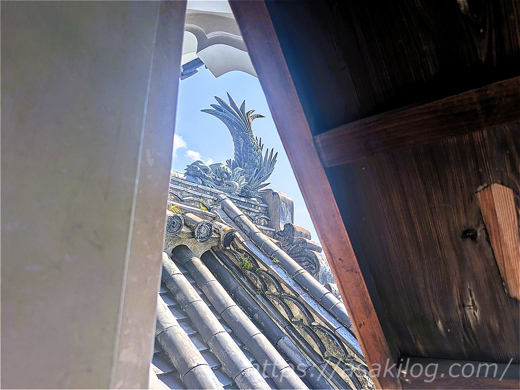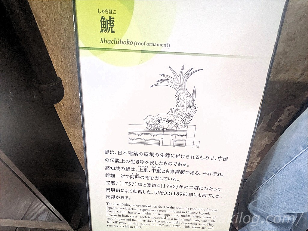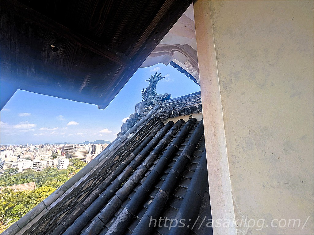 高知城の天守には、東西南北の4箇所に青銅製の美しいシャチホコが配されていますが、天守4階から東西の2体を間近に見ることができます。