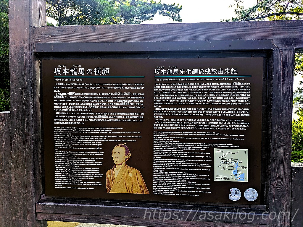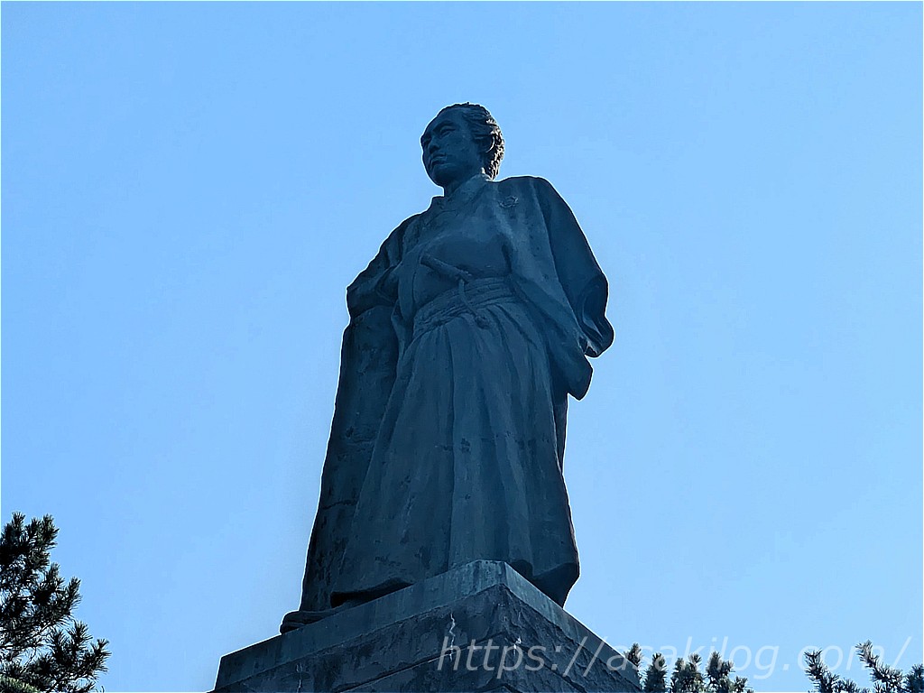 海岸沿いから、少し上がったところに、坂本龍馬像がありました。(少し逆光でした)