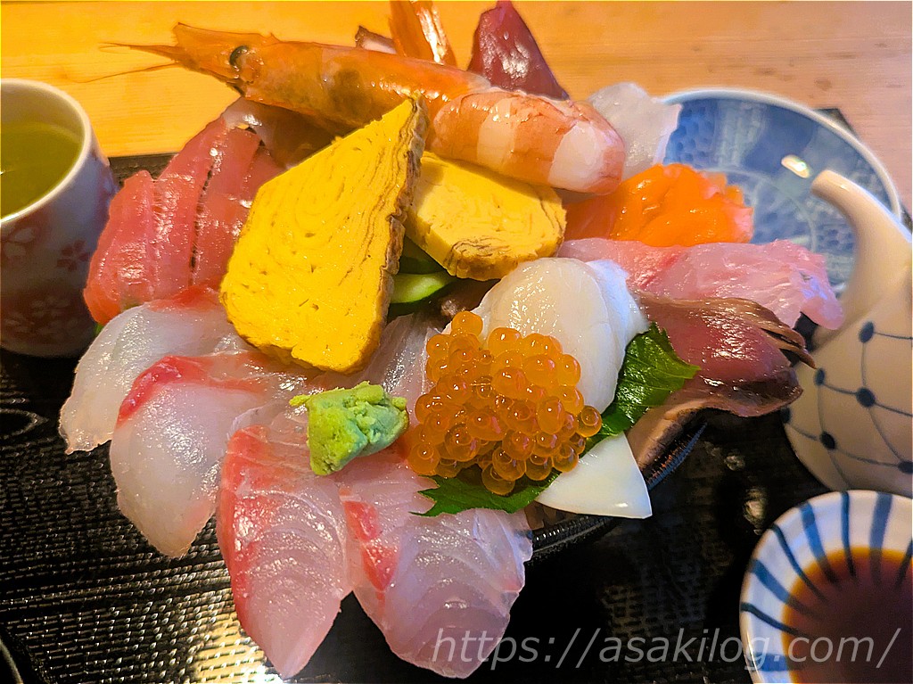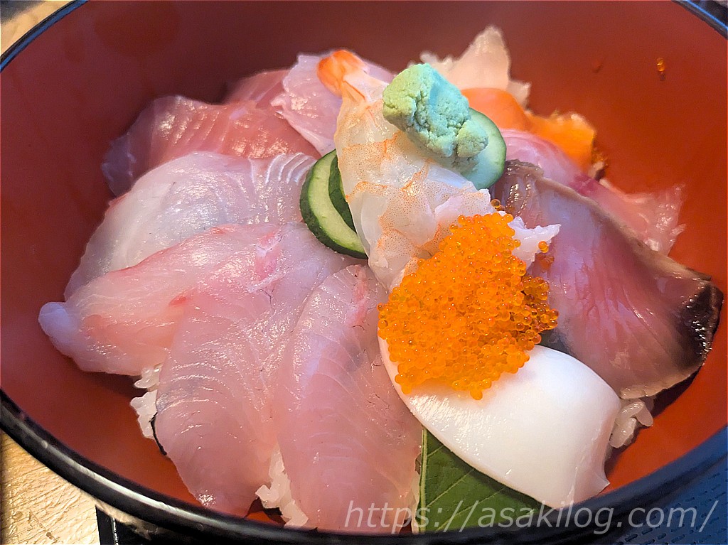 夫がオーダーしたのは、土佐沖でとれた海の幸を盛り合わせた海鮮丼「いっぱい海鮮丼(2,200円)」。こちらはとにかくボリューム満点!下のどんぶりの姿が見えないくらいにたくさんの海鮮がのっていました。