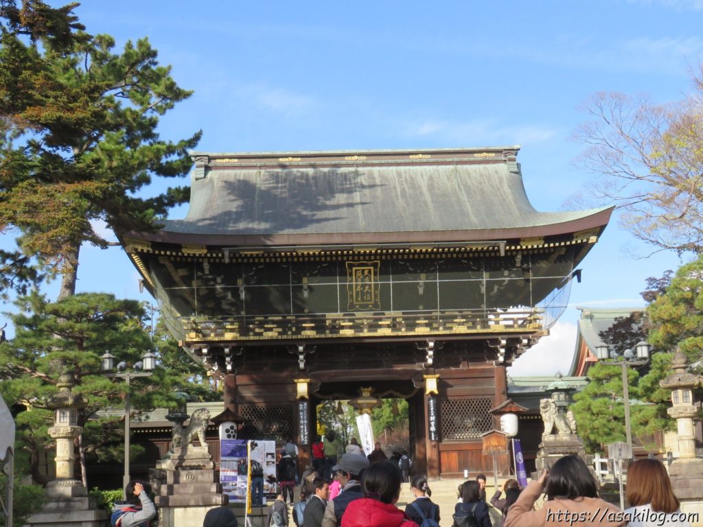 平安神宮で紅葉があまり見られなかったので、「北野天満宮」のもみじ苑へ行くことに。車で移動し、駐車場から少し歩いて、北野天満宮に到着です。
