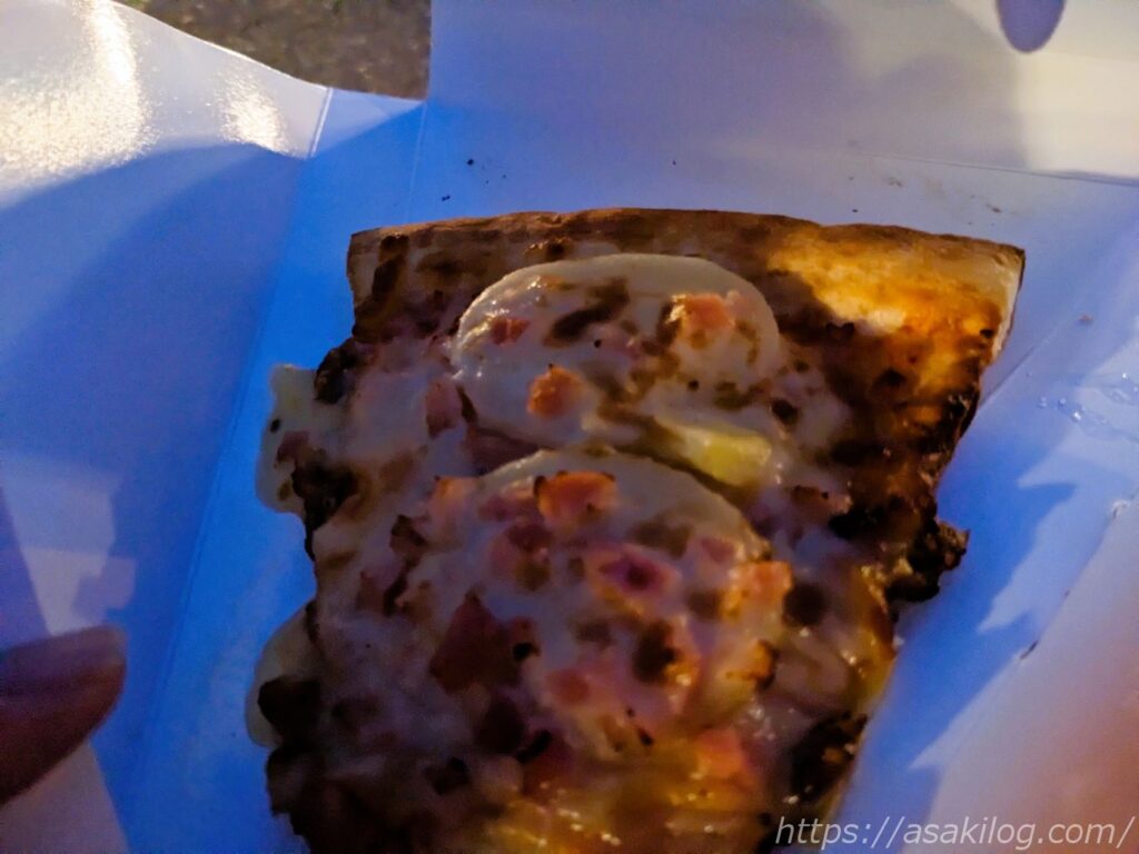 最後にエスパーニャ通りにあるピザの専門店・ピッツェリア「ピザ ラ ロハ」では、ベーコンポテトのピザをオーダー。今回ナイトパレードの席を確保ながら食べるためテイクアウト利用で、暗くて狭い場所で慌てて食べながら撮影したため、美味しそうな写真が撮れず。