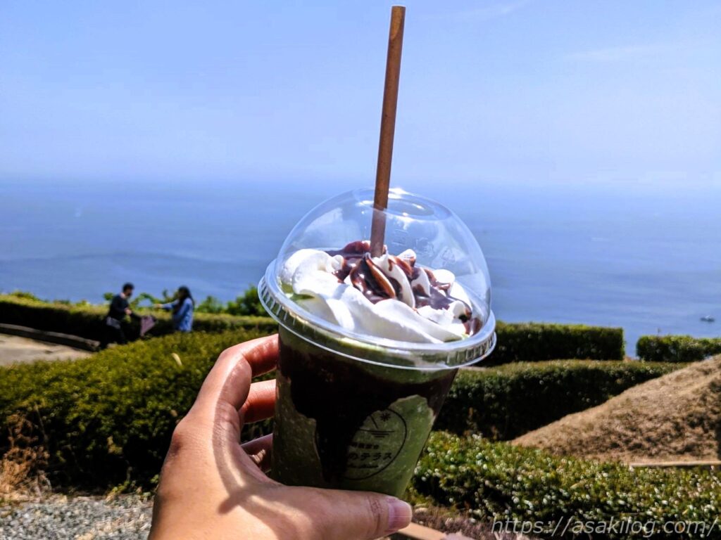 2023GWの三重旅2日目、志摩から鳥羽へ向かう途中に立ち寄った「鳥羽展望台 海女のテラス」では、カフェで「伊勢茶フラッペ(680円)」をオーダーしました。