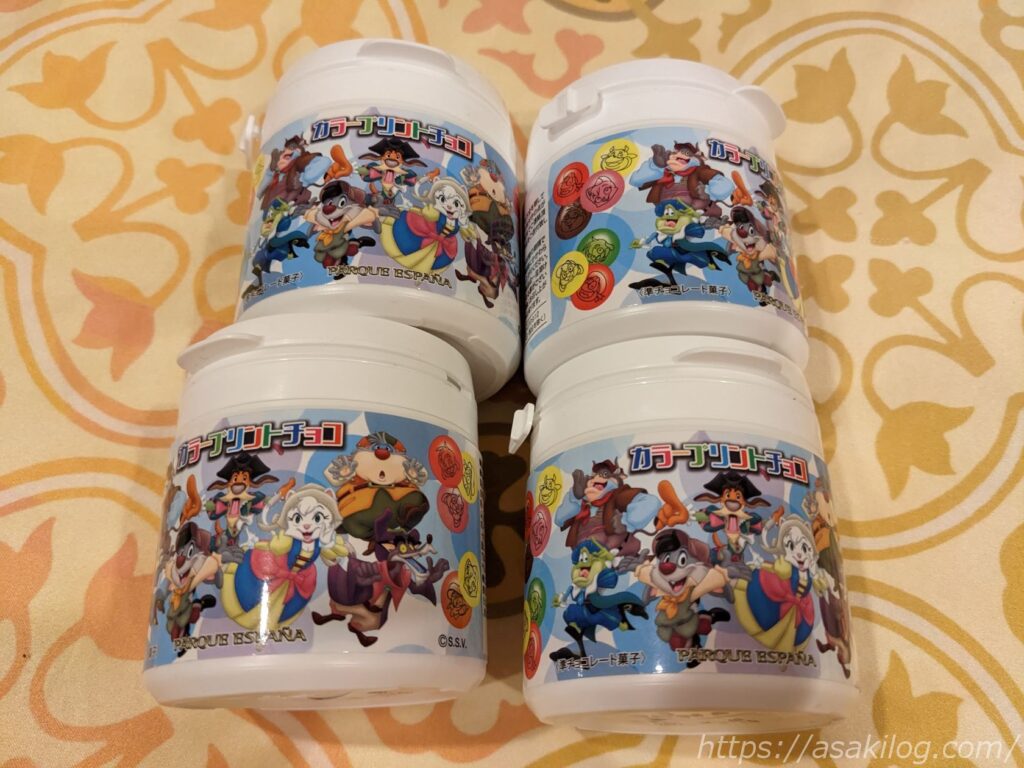 2023年GW三重旅の初日、志摩スペイン村のテーマパーク「パルケエスパーニャ」で購入したのは、こちらのカラープリントチョコだけです(娘+甥っ子姪っ子たちへのお土産のため4つ購入、合計1,800円)。