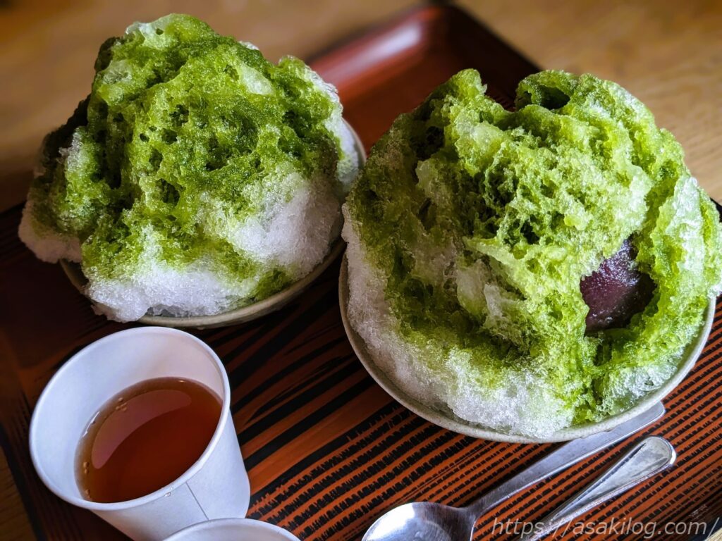「赤福 おかげ横丁 団五郎茶屋」で食べたのが、名物・赤福氷。甘すぎない抹茶蜜と餡子・お餅の組み合わせが絶品でした。娘は氷イチゴをオーダーしていましたよ(赤福氷2つ+氷イチゴ1つで、合計1,760円)。