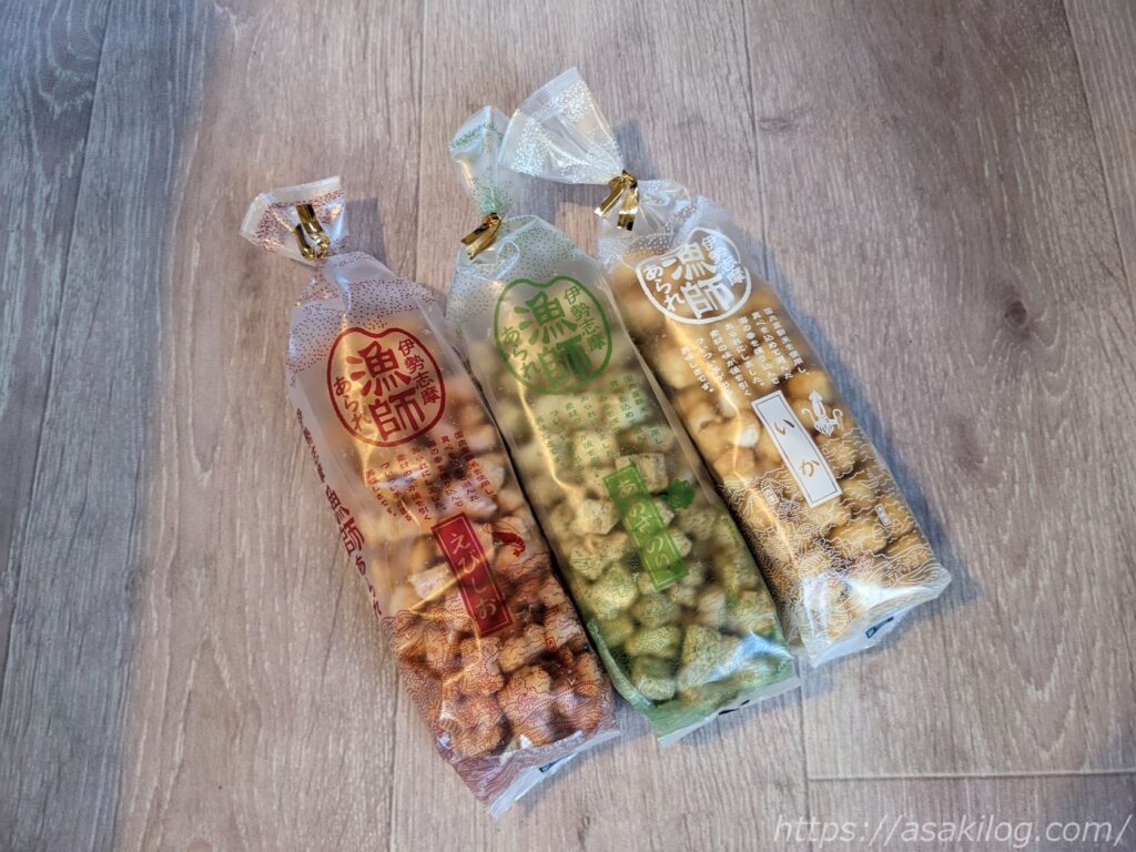 2023年GW三重旅の2日目、鳥羽展望台 海女のテラス併設のショップで購入したのは、こちらの漁師あられ3点セット×2つ(2,340円)です。