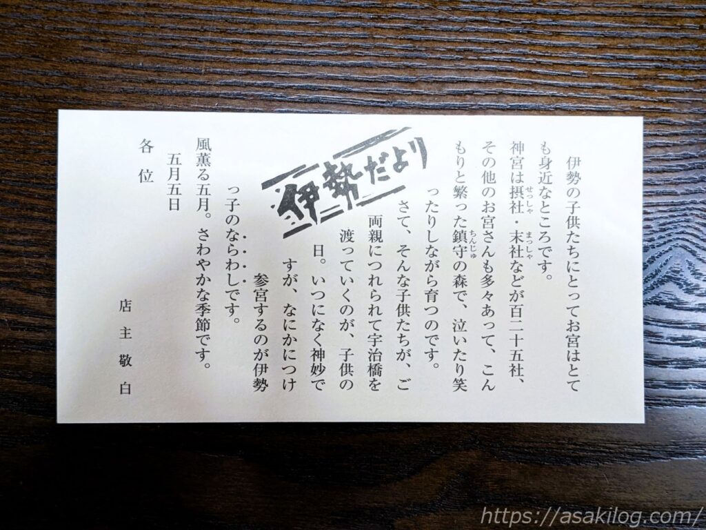 赤福餅のパッケージには、お手紙が付いていました。お手紙の内容には購入日と合わせて「五月五日」とあるので、通常も付いてくるのかは分かりませんが、とても素敵な内容でした。