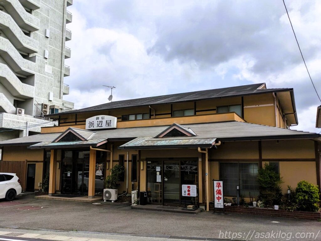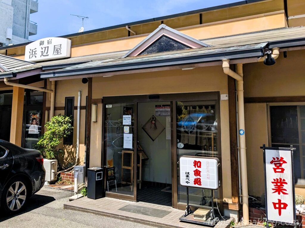 こちらが浜辺屋の外観です。1階部分に和食処「浜辺屋」も併設しています(詳しくは後ほど)。道路の反対側に、大き目の駐車場がありました。