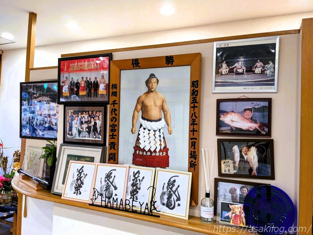 宿の入口から入ると、ロビーには元・九重部屋親方(元・千代の富士)の写真がどーんと飾ってあります。なんと生前は長年に渡り、こちらのお宿で趣味の釣りを楽しんでいたそう!
