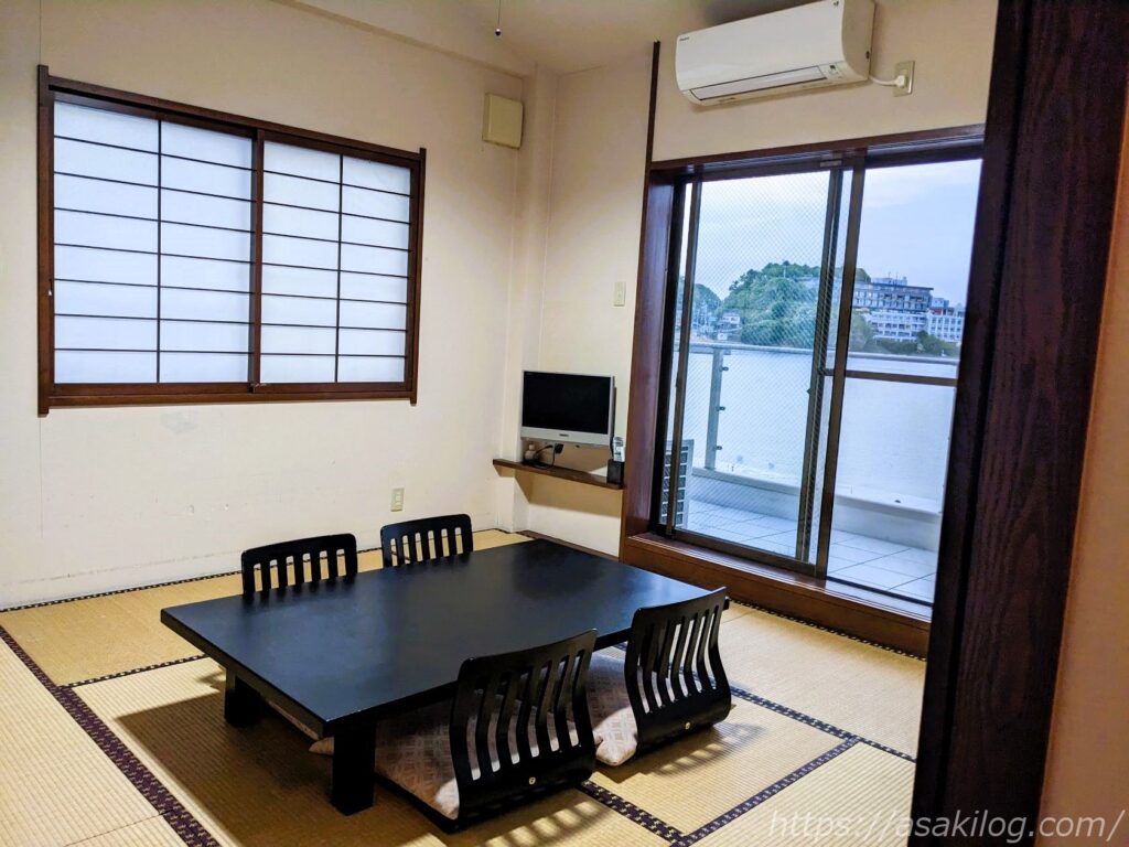 客室は和室8畳。テーブルと座椅子がセットされていて、畳のお部屋なので、のんびり足を伸ばして寛げます。